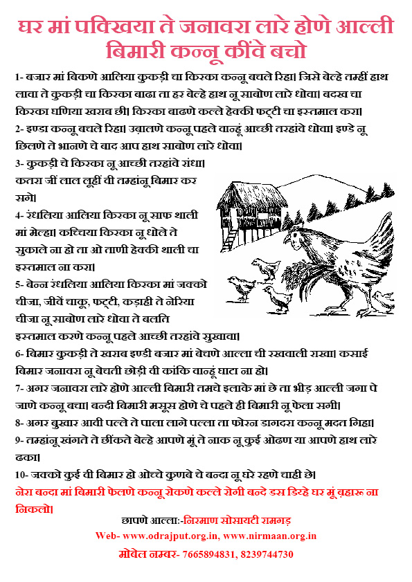 1- बजार मां बिकणे आलिया कुकड़ी चा किरका कन्नू बचले रिहा। जिसे बेल्हे तम्हीं हाथ लावा ते कुकड़ी चा किरका बाढा ता हर बेल्हे हाथ नू साबोण लारे धोवा। बदख चा किरका घणिया खराब छी। किरका बाढणे कल्ले हेक्की फट्टी चा इस्तमाल करा।
