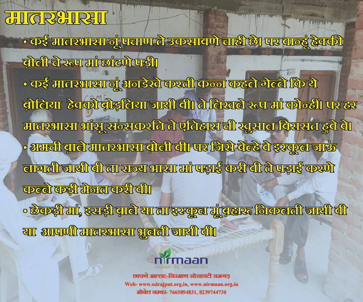 • कई मातरभासा नूं अनडेखे करती कन्न कहले गेल्ले कि ये ब़ोलिया हेक्को ब़ोड़लिया जायी वी। ते लिखले रूप मां कोन्हीं। पर हर मातरभासा भांसू सन्सकरति ते एतिहास ची खुसाल विरासत हुवे वे।